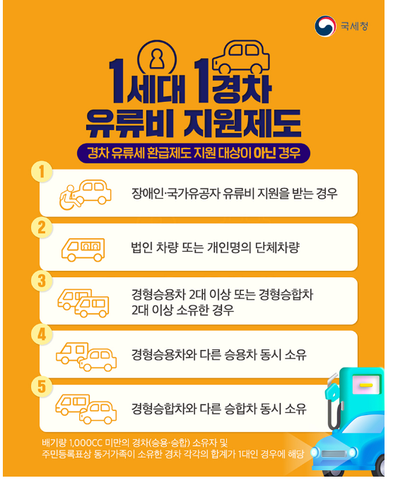 아래와 같은 경우에는 유류세 환급을 받을 수 없습니다. 세대 분리를 통해 1세대 1경차 요건을 충족해야 합니다.